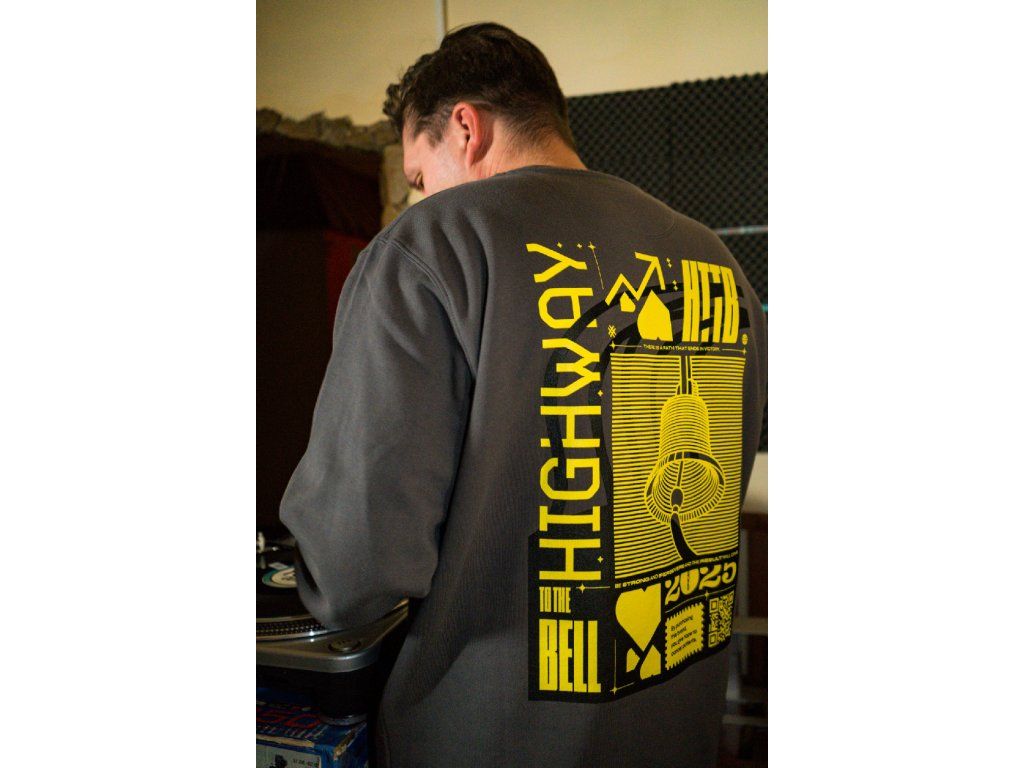 ● großformatiger Siebdruck auf dem Rücken – das zentrale Motiv der Marke Highway to the Bell