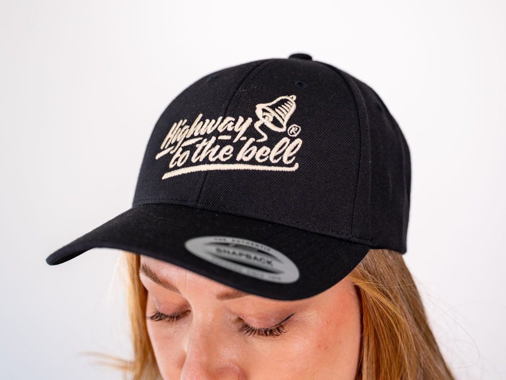 Snapback čepice v černé barvě s červenou výšivkou loga na přední straně, nastavitelné zapínání vzadu, ohnutý kšilt.