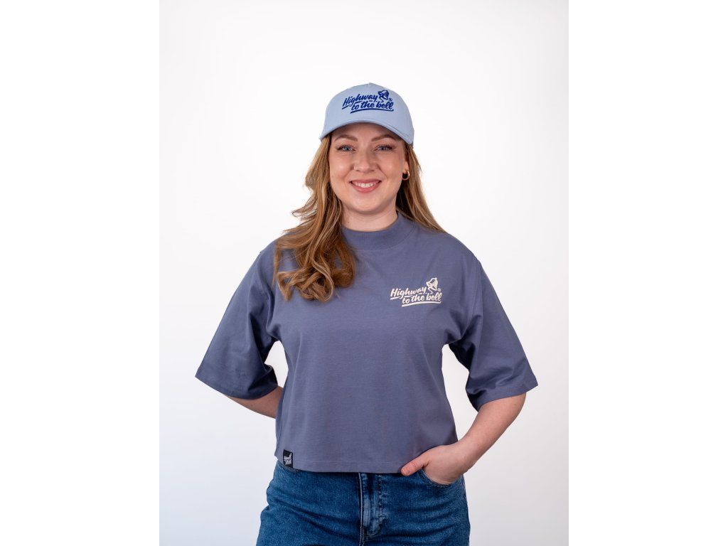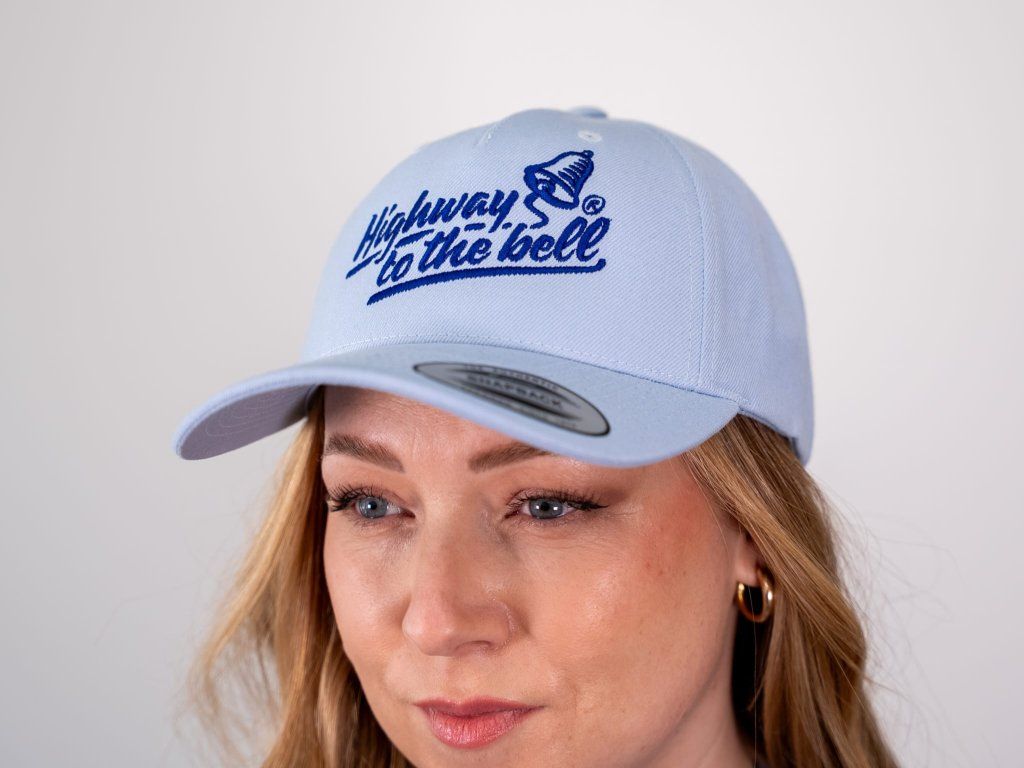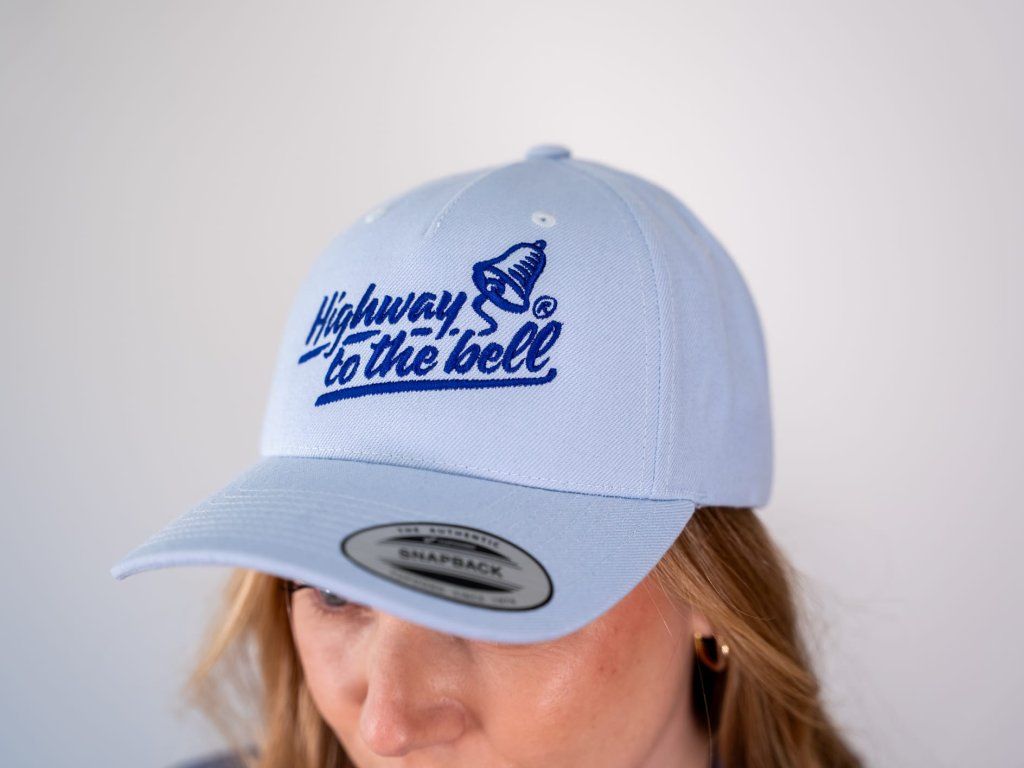 Snapback čepice ve světle modré barvě s modrou výšivkou loga na přední straně, nastavitelné zapínání vzadu, ohnutý kšilt.